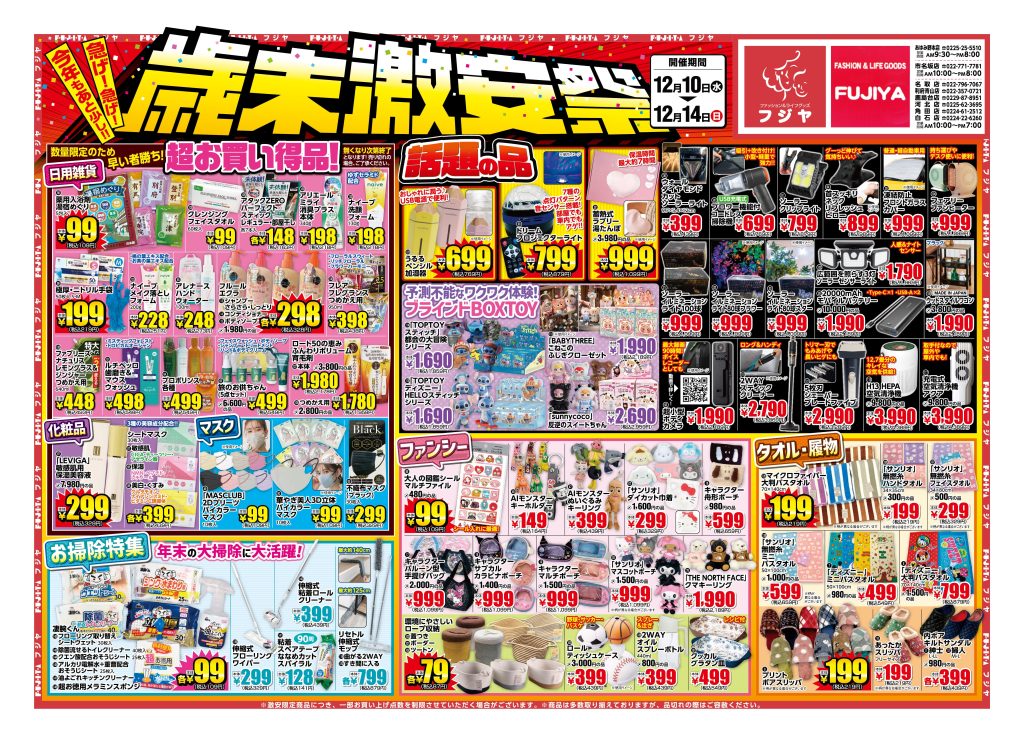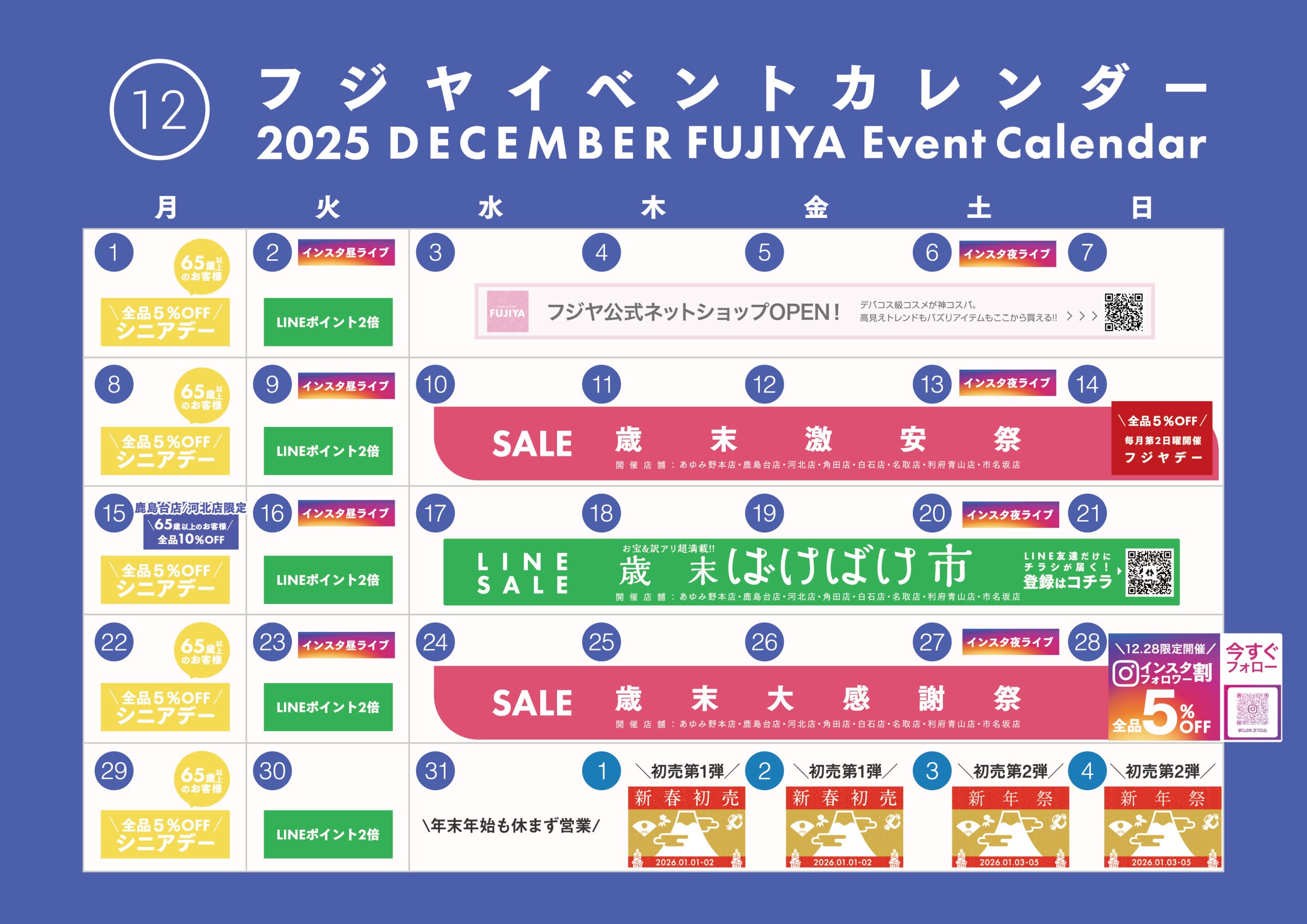2025.12.1612/17(水)→12/21(日)のチラシを掲載しました。 詳細は「最新チラシ」よりご覧いただけます。2025.12.0912/10(水)→12/14(日)のチラシを掲載しました。 詳細は「最新チラシ」よりご覧いただけます。2025.11.30イベントカレンダー更新致しました。 詳細は「こちら」よりご覧いただけます。