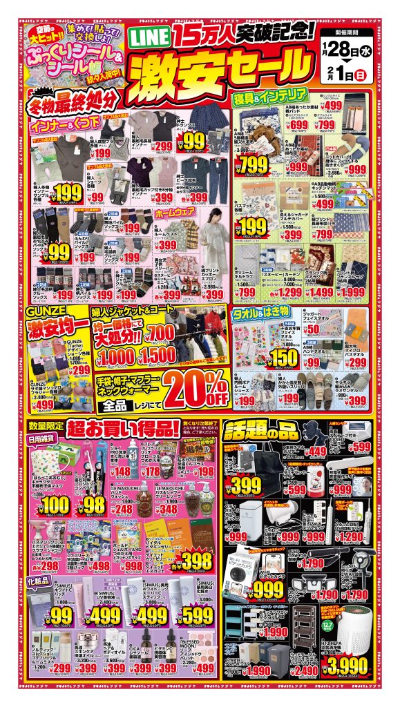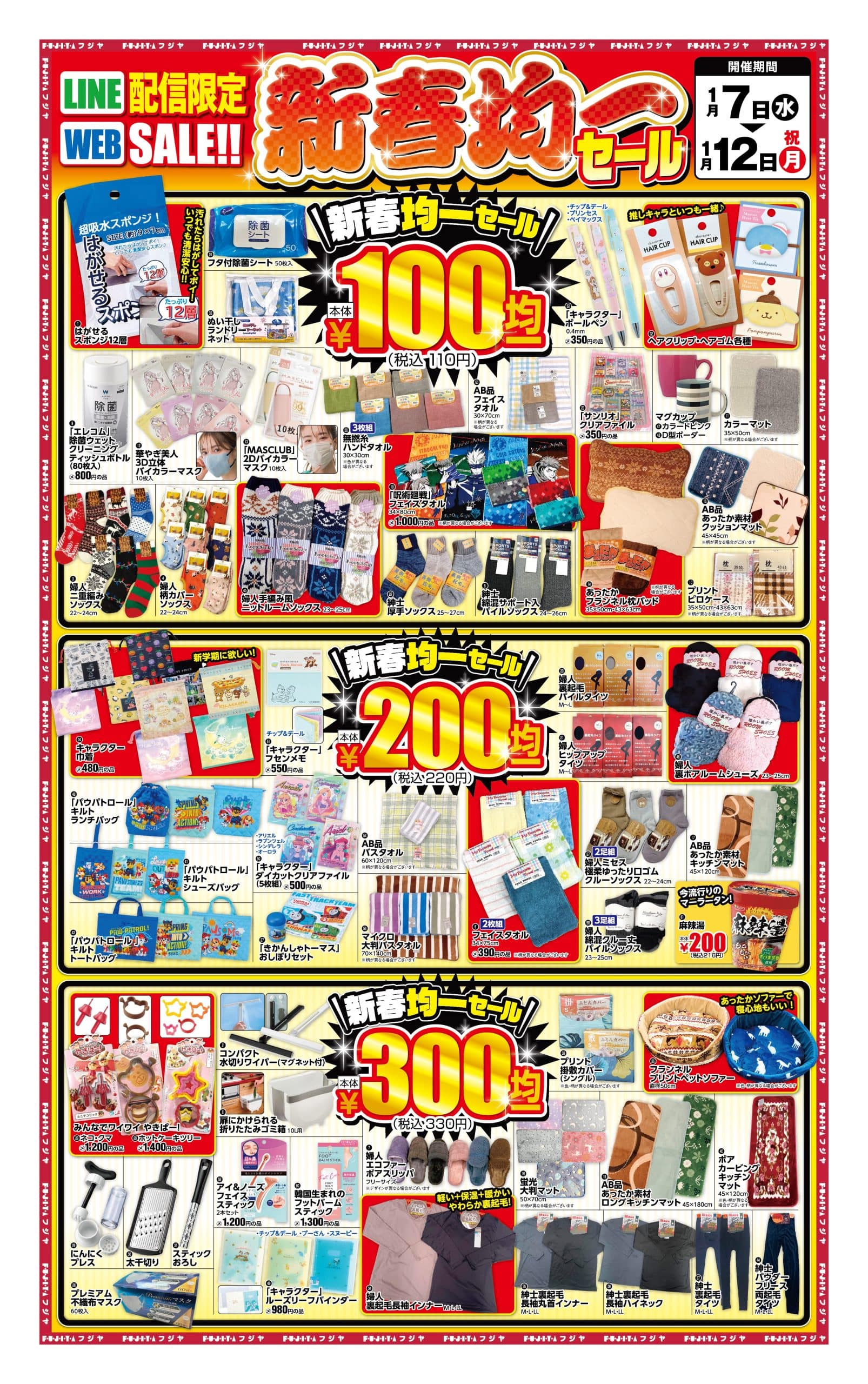 1/28(水)→2/1(日)8店舗全店LINE15万人突破記念!激安セール!! ※画像をクリックで大きく表示されます。1/7(水)→1/12(祝/月)8店舗全店新春均一セール ※画像をクリックで大きく表示されます。