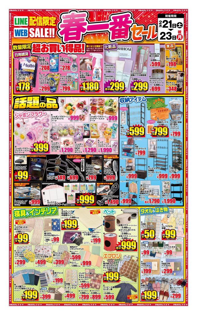2/21(土)→2/23(祝/月)あゆみ野本店、角田店、白石店、名取店、利府青山店、市名坂店春一番セール ※画像をクリックで大きく表示されます。2/18(水)→2/23(祝/月)8店舗全店春の大特価市 ※画像をクリックで大きく表示されます。