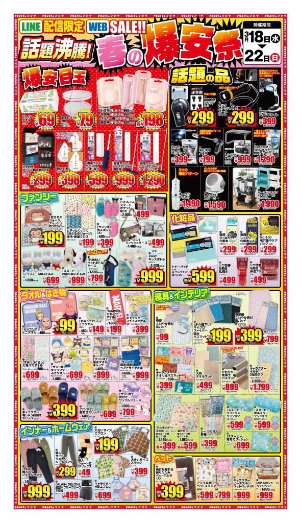 3/18(水)→3/22(日)8店舗全店話題沸騰!春の爆安祭 ※画像をクリックで大きく表示されます。3/11(水)→3/15(日)あゆみ野本店、角田店、白石店、名取店、利府青山店、市名坂店春のドッキリ満載市 ※画像をクリックで大きく表示されます。