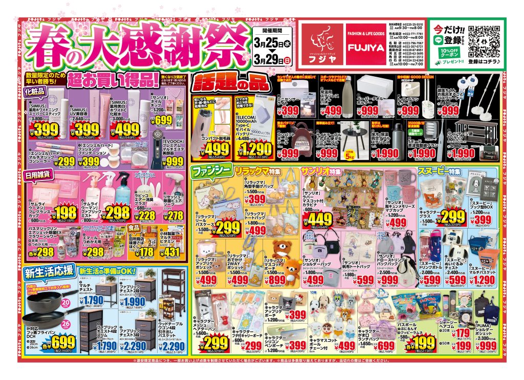 2026.03.243/25(水)→3/29(日)のチラシを掲載しました。 詳細は「最新チラシ」よりご覧いただけます。2026.03.173/18(水)→3/22(日)のチラシを掲載しました。 詳細は「最新チラシ」よりご覧いただけます。2026.03.103/11(水)→3/15(日)のチラシを掲載しました。 詳細は「最新チラシ」よりご覧いただけます。
