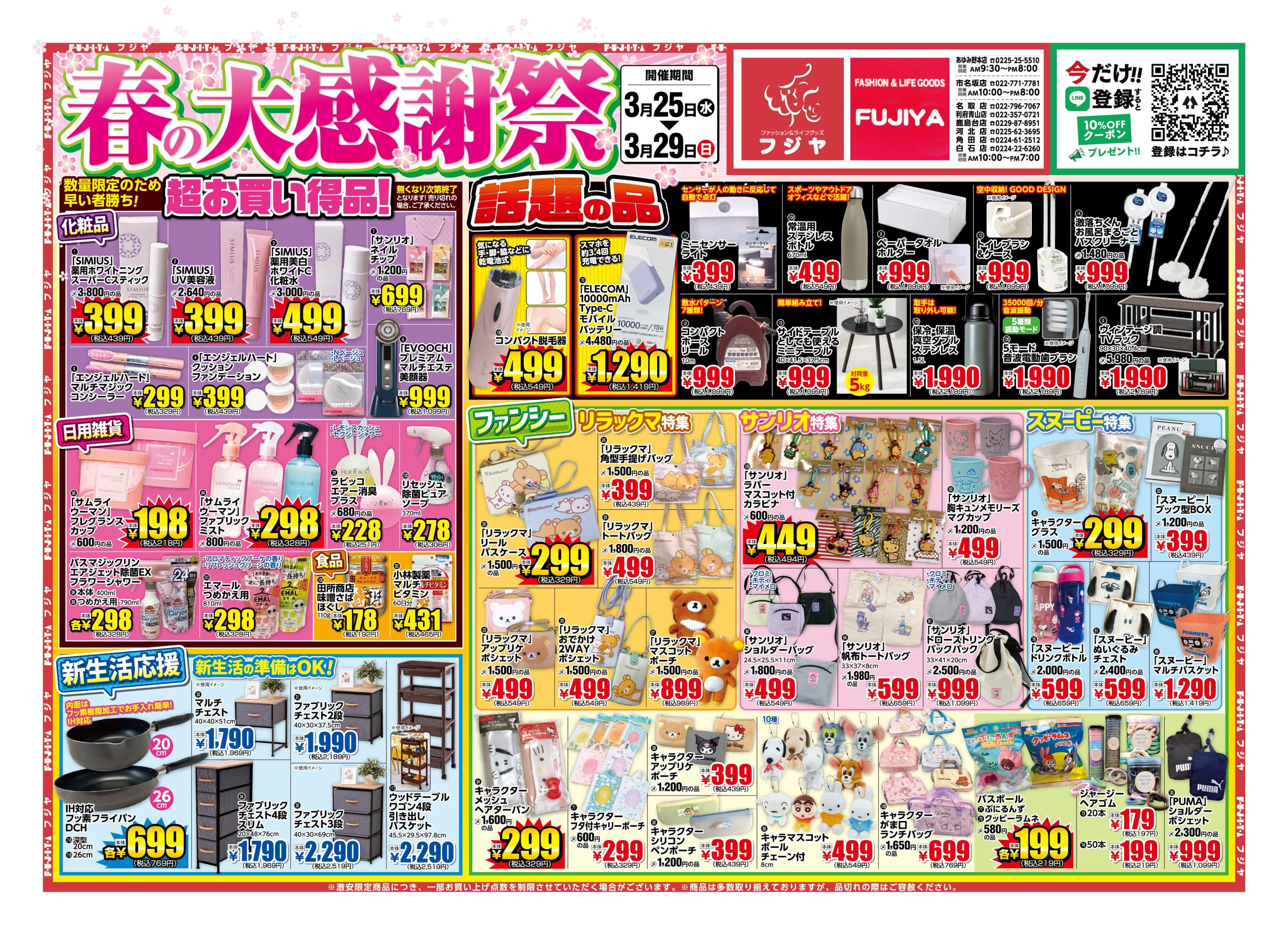 バックナンバーフジヤ公式ネットショップOPEN!「なかなかお店に行けない…」「インスタライブ中にすぐほしい!」そんな声から、ついに誕生しました。デパコス級のご褒美コスメや時短メイク、スキンケアが神コスパで勢ぞろい。激安なのに高見え、トレンドもしっかりキャッチ。ネットで話題のバズりアイテムも、ここから買えます。取り扱いアイテムはこれからどんどん増やしていく予定✨ちょっと試したくなるプチプラ優秀コスメ、毎日がちょっと楽しくなるアイテム、揃ってます。ネットショップはコチラ
